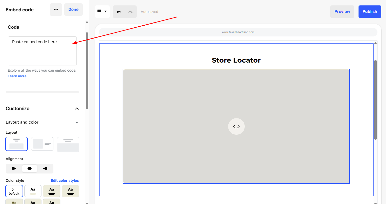 - In the editing panel, select Embed code and paste the code from step 1 into the box