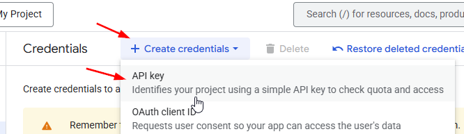 Click Create credentials and choose API key: