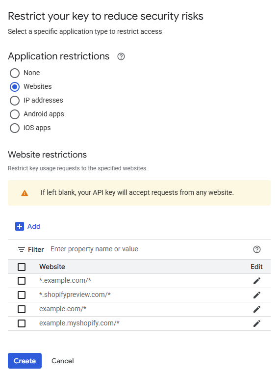 We also strongly recommend setting up usage quotas to limit the usage of your key to a reasonable amount.